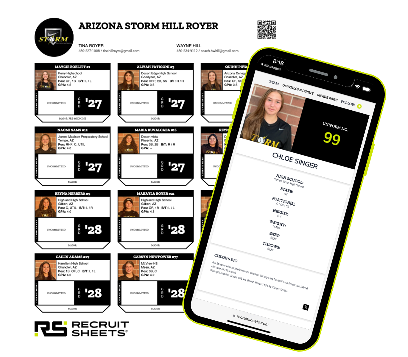 Recruit Sheets creates team and athlete profiles based on college coach feedback—showing exactly what they want, how they want it. You add the details, we do the rest. Instantly share with a QR code or print for events. No design work. No formatting. No-brainer.